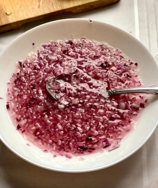 Лук очень мелко шинкуем. Теперь маринуем лук. Это займёт 2 минуты: Кладём в глубокую тарелку и заливаем кипячёной водой. Добавляем уксус 1,5 ч.л. Сахар: 2 ч.л. Соль: 0,5 ч.л. Держим лук минут 3-5 пока готовим остальные ингредиенты.