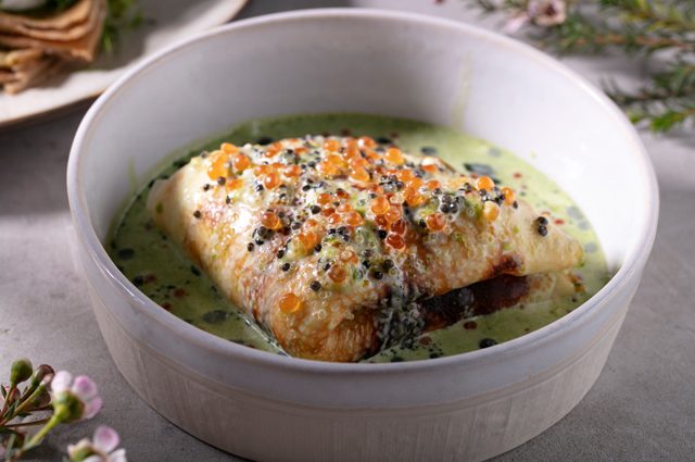 Шаг 6. Готовим соус: смешиваем сливки с рыбным соусом, добавляем кунжутное и зеленое масло и подогреваем в кастрюле до кипения. Остужаем соус до комнатной температуры, добавляем икру, аккуратно перемешиваем и поливаем готовым соусом блин на тарелке.