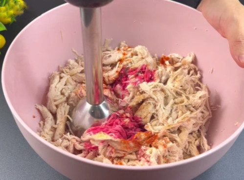 Затем перемалываем мясо блендером. Нужно измельчить его до однородной массы, чтобы не встречались даже мелкие кусочки.