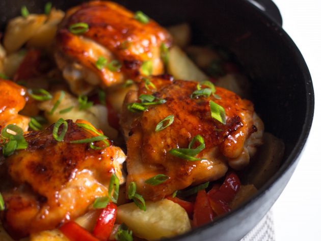 Выложите куриные бёдра поверх содержимого сковороды. Смешайте соус (мы использовали шрирача) с мёдом.