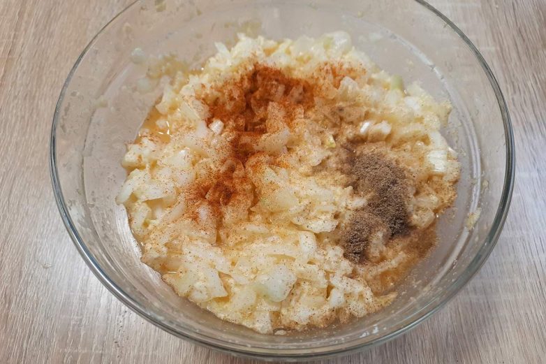 По истечении этого времени добавь специй. Паприка сделает наши луковые оладьи золотистыми, а кинза добавит в них пряную нотку.