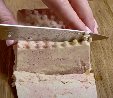 Собираем шумовкой заготовку из сыворотки в форму. Ставим сверху пресс и на 3 часа убираем в холодильник.
