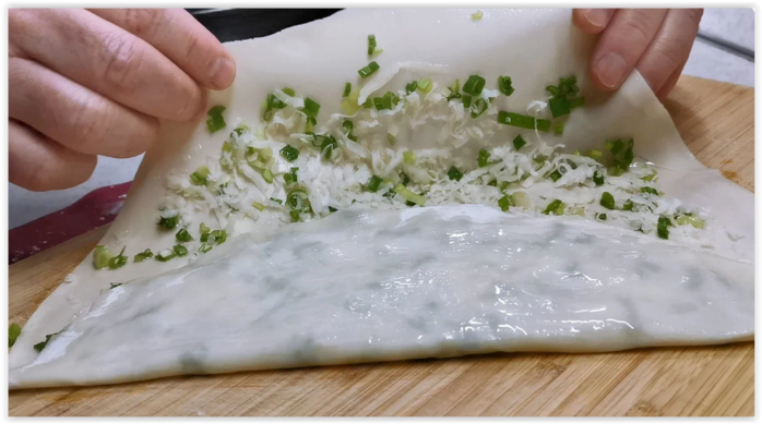 Присыпаем стол и шарик теста мукой и раскатываем в максимально тонкий пласт. Раскатывается тесто несложно. Смазываем весь пласт кроме самого краешка растительным маслом. Раскладываем начинку. У нас это зеленый лук и натертый сыр. Дальше складываем лепешку. Накрываем одной третью, смазываем ее маслом, накрываем другой третью, тоже смазываем.