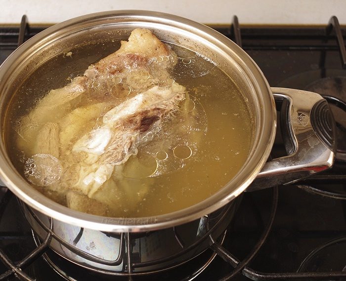 Для начала нужно приготовить говяжий бульон. Налейте в кастрюлю три литра холодной воды, положите луковицу и мясо. Доведите на среднем огне до кипения, затем уменьшите огонь и добавьте специи: соль, черный перец горошком, лавровый лист. Не накрывайте кастрюлю крышкой, чтобы не пропустить начало появления пены. Ее нужно снимать постоянно, иначе бульон получится мутным. Мясо следует варить около полутора-двух часов – когда оно начнет отставать от кости, бульон можно будет выключать и процеживать. Достаньте мясо, нарежьте небольшими кусочками – его нужно будет в конце добавить в борщ.