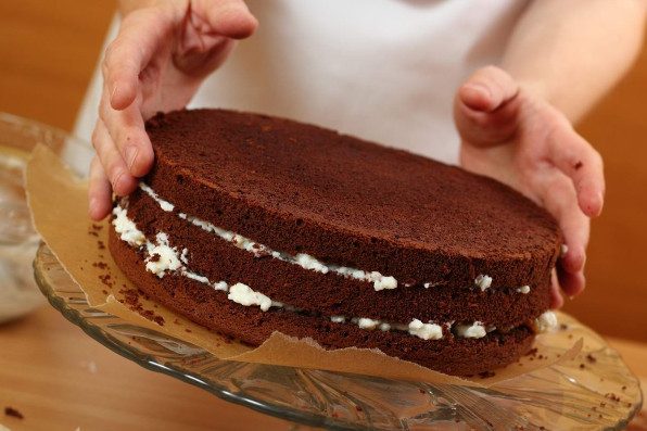 Дай бисквиту остыть. Затем срежь верхушку. Ее надо будет измельчить в крошку для украшения торта.
