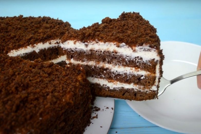 Собери торт, обильно смазывая коржи кремом. Смажь кремом бока и верхнюю часть торта. Затем посыпь всё заранее приготовленной крошкой.