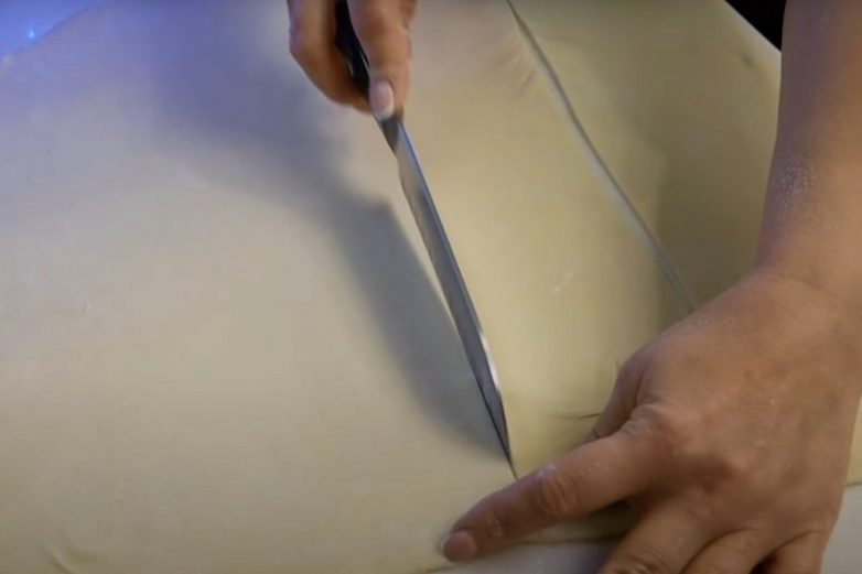 Раскатай тесто в тонкий лист. Отсеки круглые края, оставляя прямоугольный кусок. Раздели его на тонкие прямоугольники.