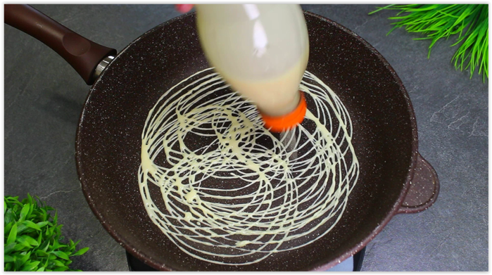 Сковороду разогреваю и выдавливаю немного теста из бутылки, создавая произвольные узоры.