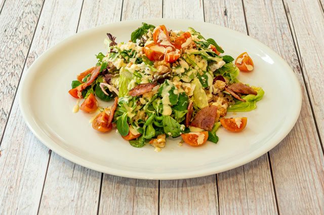 Салат с яйцами, грудинкой и помидорами