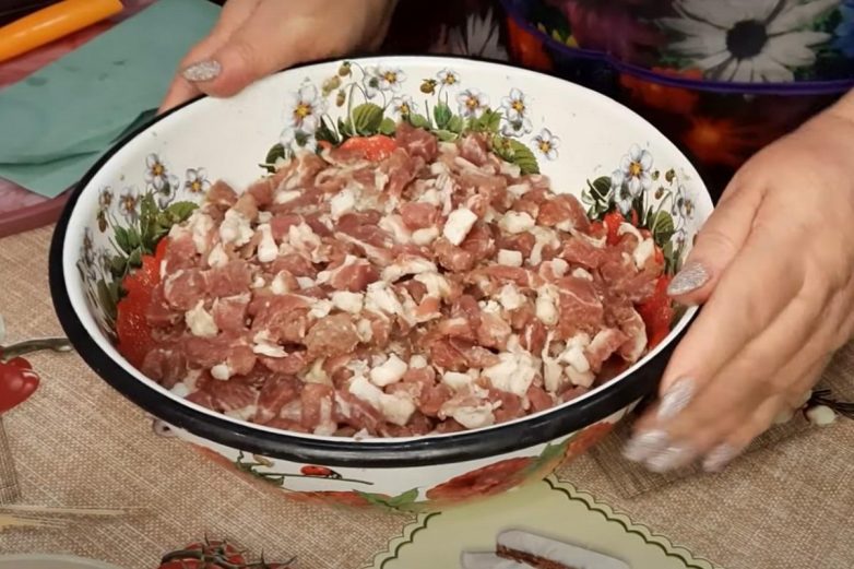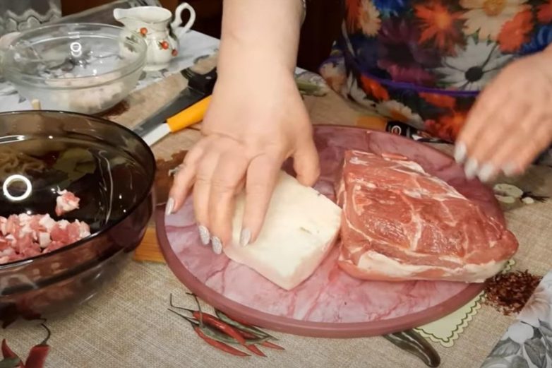 Удали с сала шкурку. Острым ножом нарежь мясо и сало кубиками со стороной около одного сантиметра. Сало можно нарезать даже чуть-чуть мельче.
