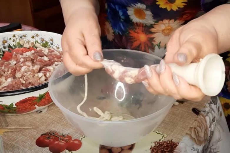 Надень промытую в воде оболочку на рожок. Начини оболочку фаршем, стараясь не порвать.