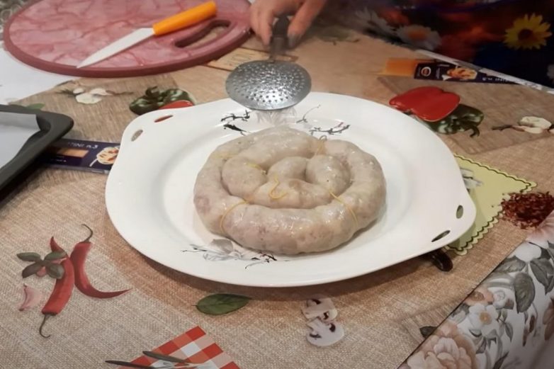 Тем временем сверни колбасу в кольцо и туго перевяжи шпагатом. С помощью зубочистки сделай в оболочке отверстия, чтобы колбаса не полопалась.
