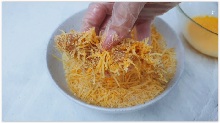 В отдельной миске взбалтываем 2 яйца. Замаринованные кусочки куриного мяса сперва окунаем во взбитые яйца. Затем обваливаем в сухарях с сыром.