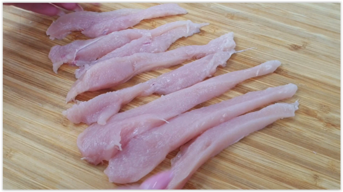 2 куриных филе нарезаем на тонкие полоски.