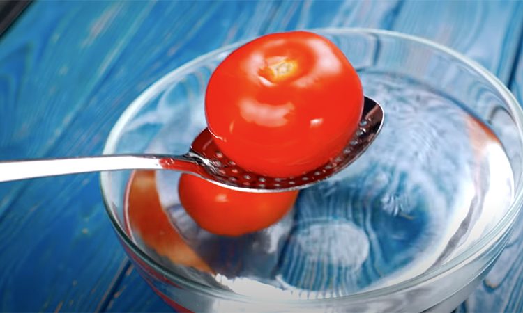 Способ работает как с крупными помидорами, так и с сортом черри. Главное, не оставляйте томаты в очень горячей воде, это приведет к обратному эффекту.