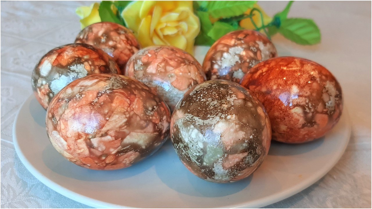 Остывшие яйца избавим от марли и луковой шелухи, выкладываем их на тарелку и дадим остыть. Для красивого блеска можно натереть яйца небольшим количеством растительного масла. Мраморные яйца на Пасху готовы! Более подробный рецепт приготовления смотрите на видео. Светлого праздника Пасхи!