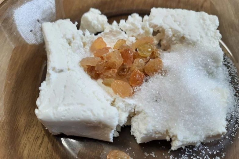 После этого смешай его с творогом, добавь ванильный сахар и сахарный песок по вкусу.