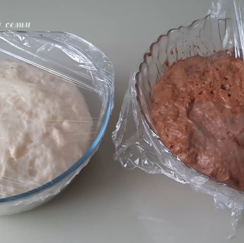 Миски с тестом закрываем пищевой пленкой и оставляем на 1,5 часа подниматься в тепле.