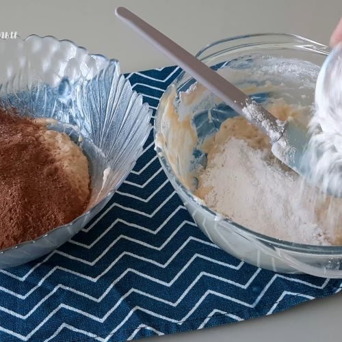 Будем делать светлое и темное тесто. В одну миску всыпаем 2 ст.л. с горкой какао, а в другую миску всыпаем 2 ст.л. с горкой муки. Месила я тесто лопаткой, так как оно должно быть не очень плотное и липнет к рукам. Если тесто получается очень жидким добавьте еще по 1 ст.л. муки в каждую из мисок.
