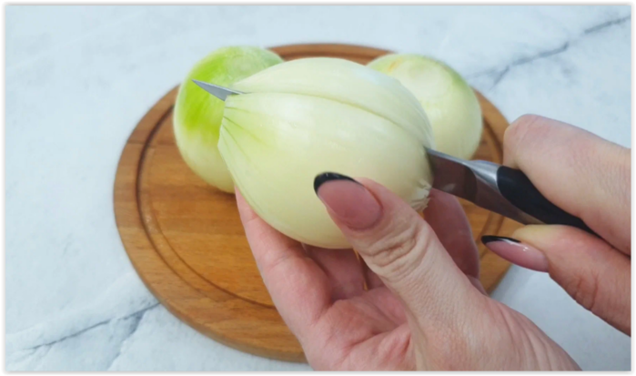 Берем 3 луковицы и делаем надрез до середины в каждой.