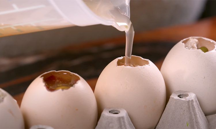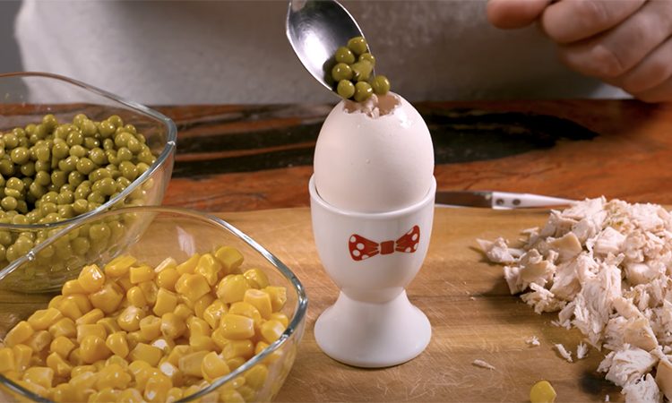 В самом конце солим и достаем овощи. Затем нарезаем вареную морковь и курицу на более мелкие кусочки, а перец и лук – мелкими кубиками. Бульон процеживаем через сито, так он будет горячим. Добавляем к нему желатин и даем остыть. В яйцах делаем отверстие, все изнутри выливаем и промываем скорлупу.