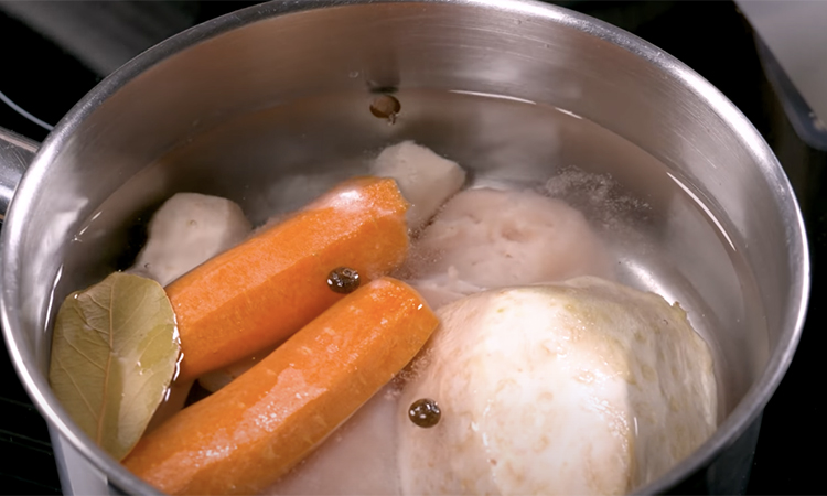 Начинаем с варки бульона: в кастрюлю кладем промытую курицу, очищенные и вымытые овощи. Удобнее всего взять морковь, петрушку, сельдерей, лук-порей. Теперь добавляем специи: лавровый лист, душистый перец, перец горошком, заливаем холодной водой и ставим кастрюлю на огонь. Провариваем на самой маленькой температуре 50 минут.