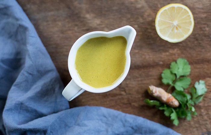 Возьмите половину лимона, одно яйцо, один стакан молока, одну столовую ложку муки, одну столовую ложку горчицы, одну столовую ложку оливкового масла, чайную ложку куркумы, перец и соль по вкусу.