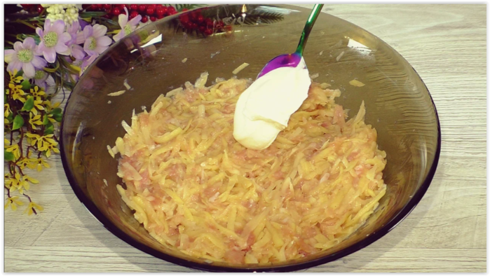 В миску с фаршем отправляем натёртый картофель.