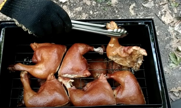 Многие коптят окорочка и сало совершенно не правильно, добавляя слишком много щепы, или заматывая продукты в марлю. Опытный кулинар показал как коптить на даче по ГОСТу: для примера взял окорочка, сало и грудинку.