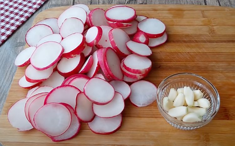 Весь редис нарезаем в меру тонкими слайсами. Очищенные с двух головок чеснока зубчики нарезаем также слайсами.