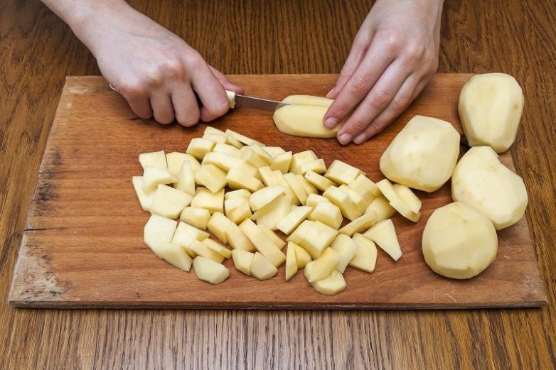 Добавь очищенный и порезанный кусочками картофель и зеленый горошек. Вари около 20 минут до готовности картофеля.