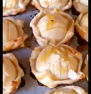 На каждый квадрат теста выкладывай половинки яблока и приподнимай края теста. Защипывая края теста, формируя что-то наподобие тарелочки. Переложи слойки на противень, застеленный пергаментной бумагой.