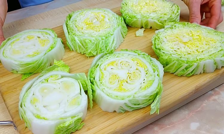 Цельный кочан пекинской капусты нарезаем круглыми кусками толщиной 2-3 сантиметра, оставляя при этом мягкий и твердый конец для других блюд, например, салата.