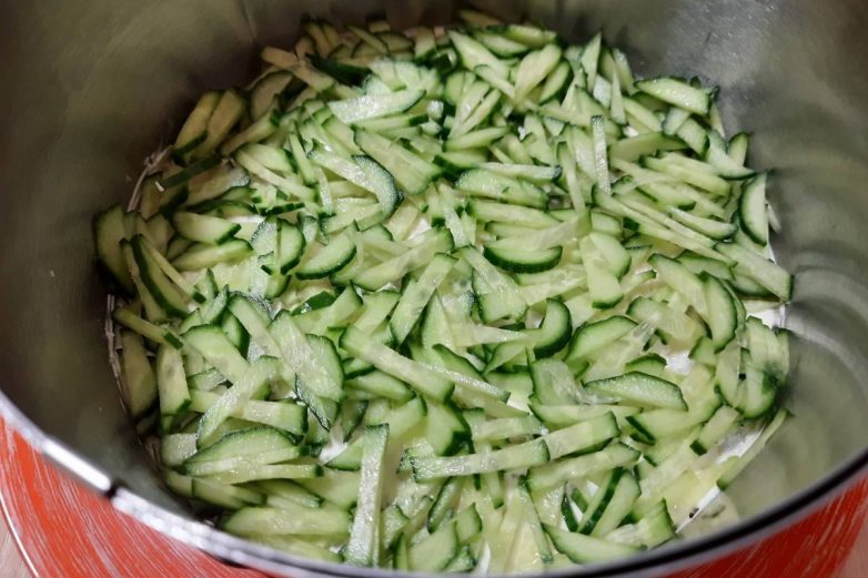 Второй слой — огурцы и майонез. Вместо покупного мы предлагаем приготовить натуральный, более вкусный и нежный вариант знакомого всем соуса.