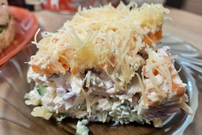 Шестой слой отварная морковь и майонез.