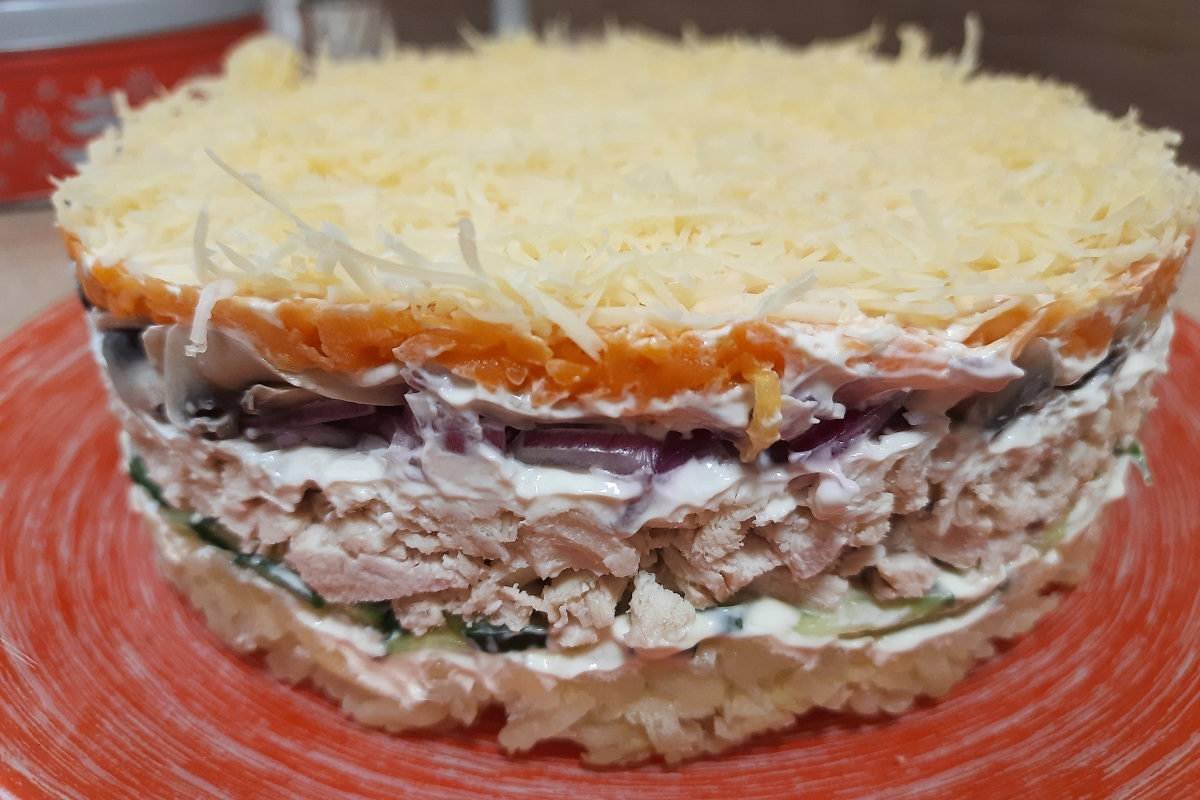 Салат с шампиньонами и огурцами — вкусный и относительно легкий. Ведь в его составе отварная курица, свежие огурцы и вареная морковь. К тому же «Бедный граф» украшает праздничный стол сочетанием своих ярких слоев.