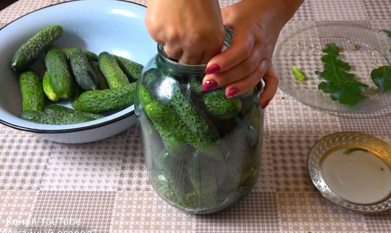 Затем наполни банку доверху огурцами максимально плотно. Выбирай неперезревшие огурцы примерно одинакового среднего размера.