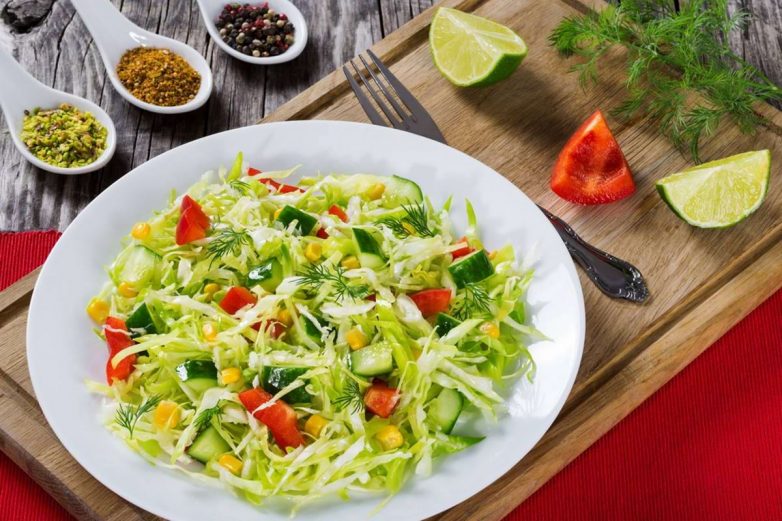 Желтая кукуруза и красный перец на фоне зеленой капусты напоминают о весне и поднимают настроение.