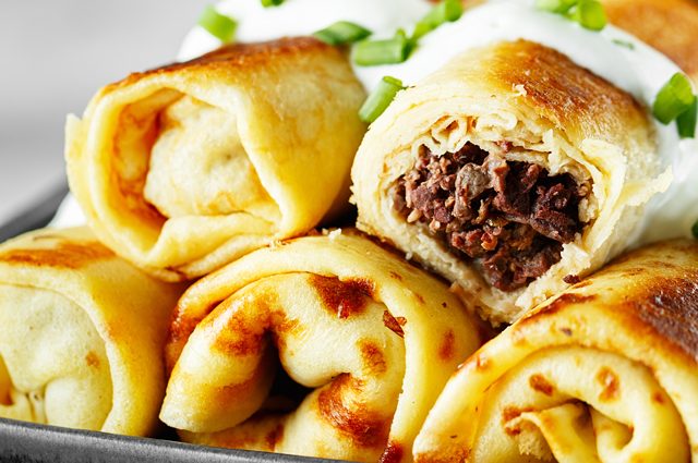 Шаг 7. Налить тесто на сковороду, обжарить с одной стороны, выложить на блин начинку с сердечками, завернуть блин конвертиком, обжарить с другой стороны.