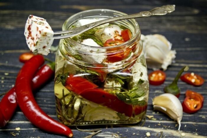 А вот брынза, приготовленная в маринаде со специями, станет отличным поводом для посиделок в кругу семьи и друзей под бутылочку хорошего вина или пива.