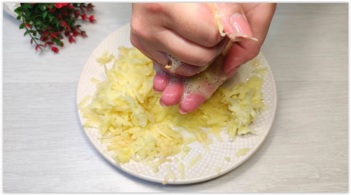 1. Очищаю картофель и натираю его на крупной терке. Далее отжимаю картошку от лишнего сока.