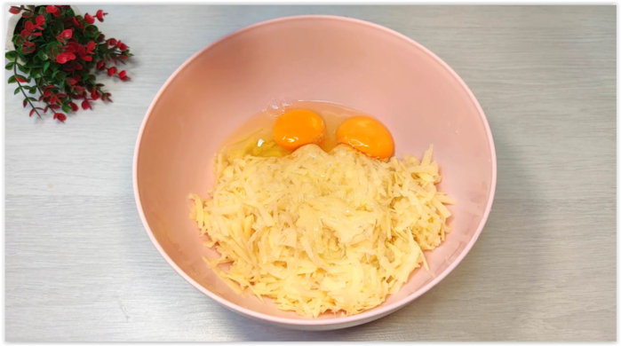 2. Выкладываю картошку в глубокую миску и затем разбиваю к нему пару яиц.