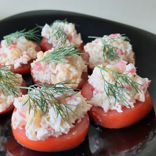 Помидоры режем на слайсы толщиной около 5 мм. и выкладываем на них салат. Вместо помидоров, как я уже писала выше, можно взять поджаренный хлеб или закусочные корзиночки.