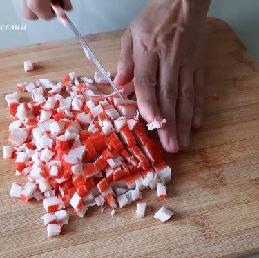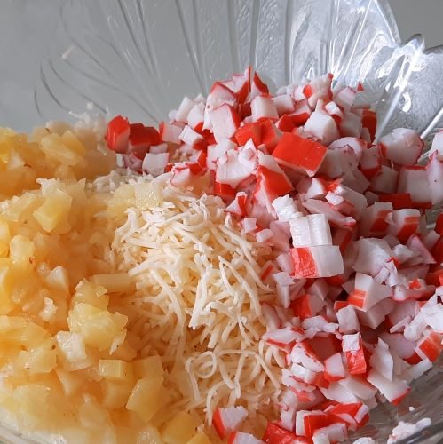 Берем терку и трем на мелкой ее стороне сыр, яйца и чеснок, а потом берем разделочную доску и режем мелким кубиком крабовые палочки и ананас. Все ингредиенты смешиваем вместе и заправляем майонезом.