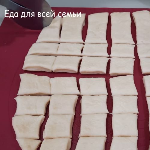 Выкладываю тесто на разделочный коврик, растягиваю руками пласт, далее помогаю скалкой. Пласт нужно сделать квадратным. Ножом нарезаю на 64 части (в начале пласт режу на 4 части, потом каждую из частей еще на на 16).