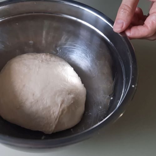 Замешиваем тесто. Оно не сильно тугое и немного липнет к рукам. Формируем колобок, смазываем его растительным маслом, оставляем на расстойке в миске под крышкой или под пленкой на 1,5 часа.