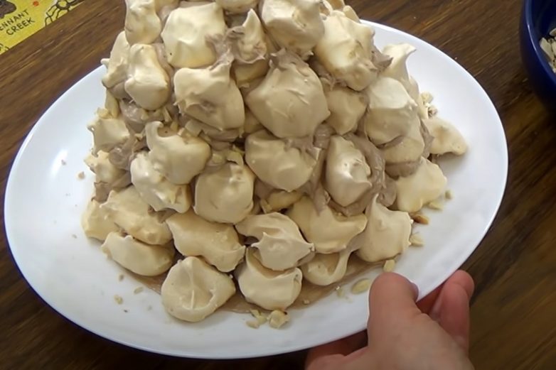 Продолжай действовать таким способом, пока не используешь всё безе. В идеале должен получиться симметричный конус из смазанных кремом и посыпанных орехами кусочков безе. Укрась его остатками орехов и поставь на один час в холодильник.