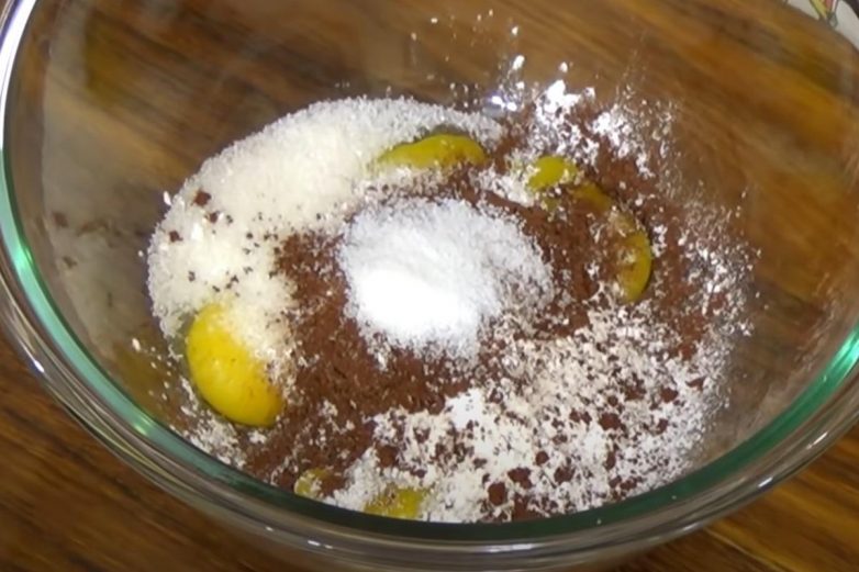 К четырем желткам добавь 100 грамм сахара, крахмал, какао и ванильный сахар. Хорошо перемешай.