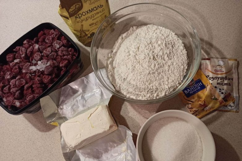 Тем временем можно приготовить начинку. Замороженную вишню смешай с сахаром в сотейнике или кастрюльке с толстым дном, поставь ее на средний огонь. Вишня начнет пускать сок — этого мы и добиваемся. Пускай начинка пару минут прокипит. Затем добавь в нее кукурузный крахмал. Уваривай смесь, постоянно помешивая ее, в течение нескольких минут. Когда масса начнет густеть, можешь убрать вишню с плиты.