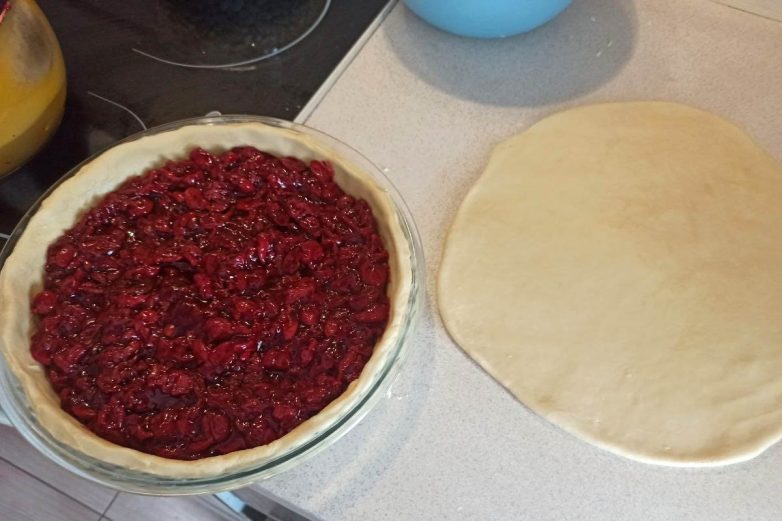 Выложи на тесто начинку и аккуратно ее разровняй. Из оставшегося теста можешь сделать такой же пласт и просто накрыть им пирог. Но мне понравился вариант с плетенкой. Для этого тесто надо раскатать и вырезать из него продолговатые полоски. А затем положить их на начинку, переплетая полоски между собой.